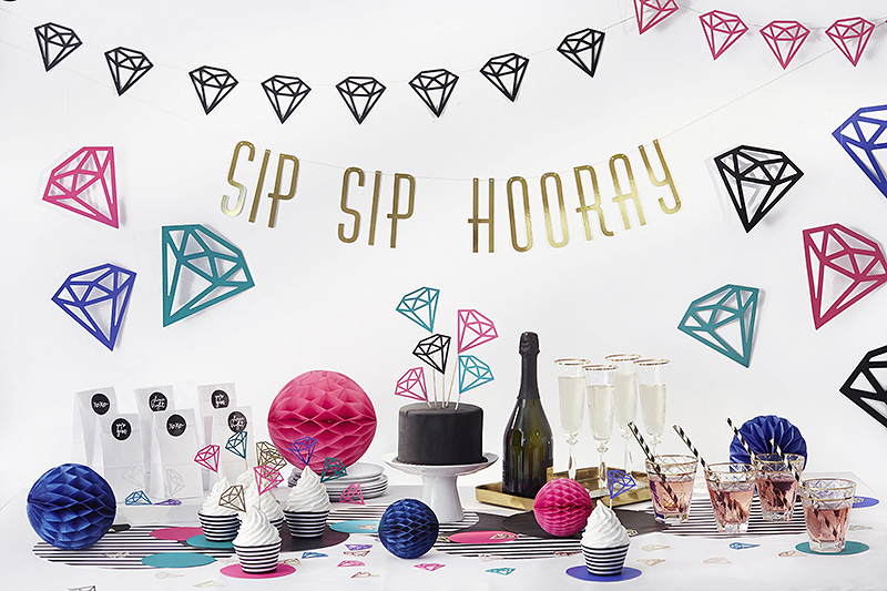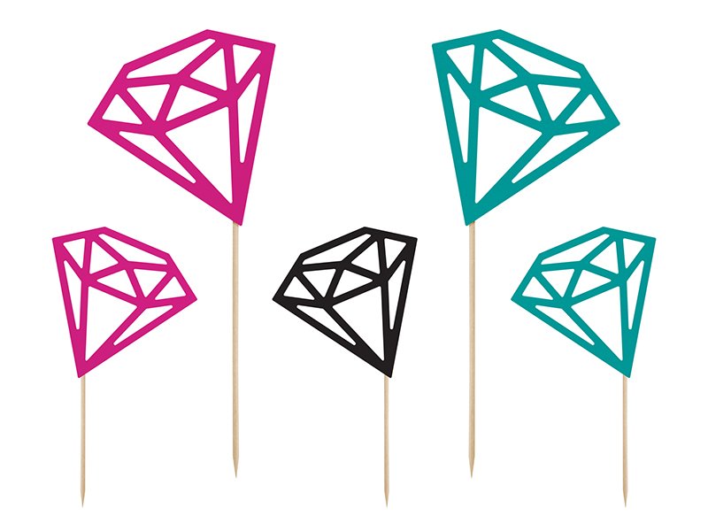 Zestaw pięciu papierowych kolorowych topperów w kształcie diamentów.